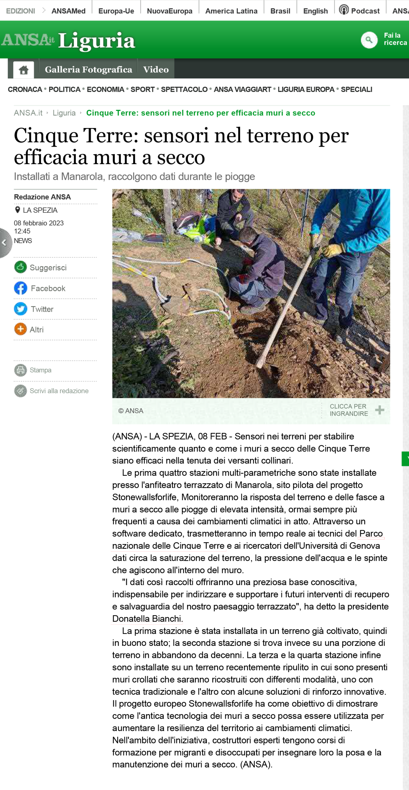 | Ansa Liguria | 08/02/2023 | Cinque Terre, sensori nel terreno per efficacia muri a secco | view |