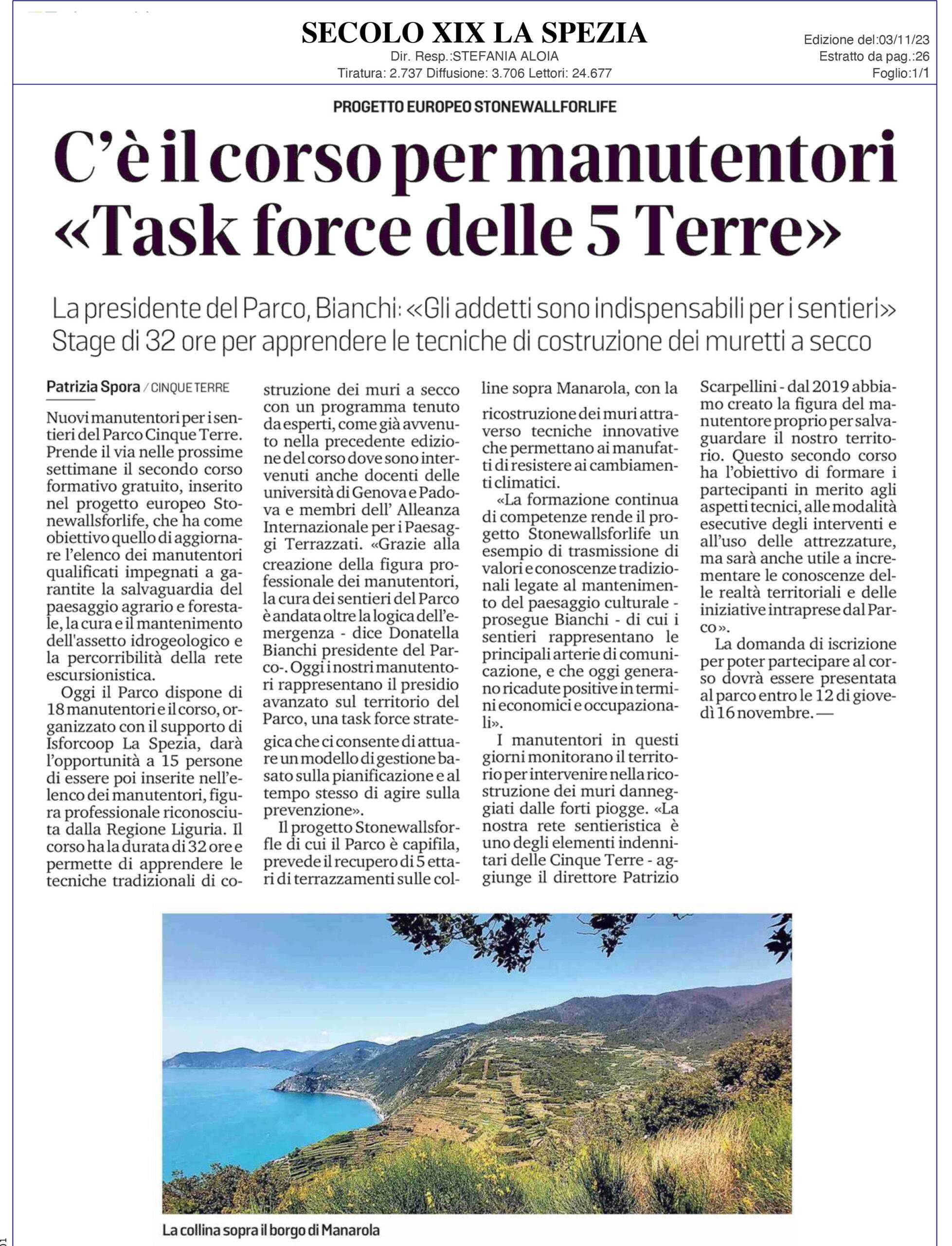 | Il Secolo XIX | 03/11/2023 | C’è il corso per manutentori “Task force delle Cinque Terre“ | download |