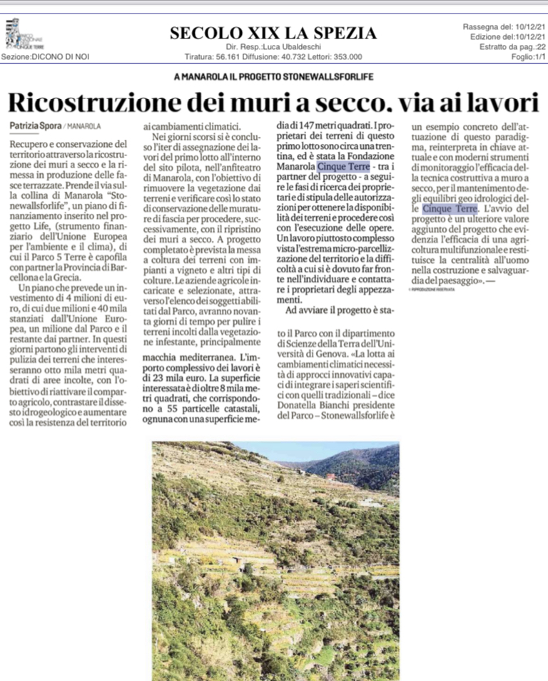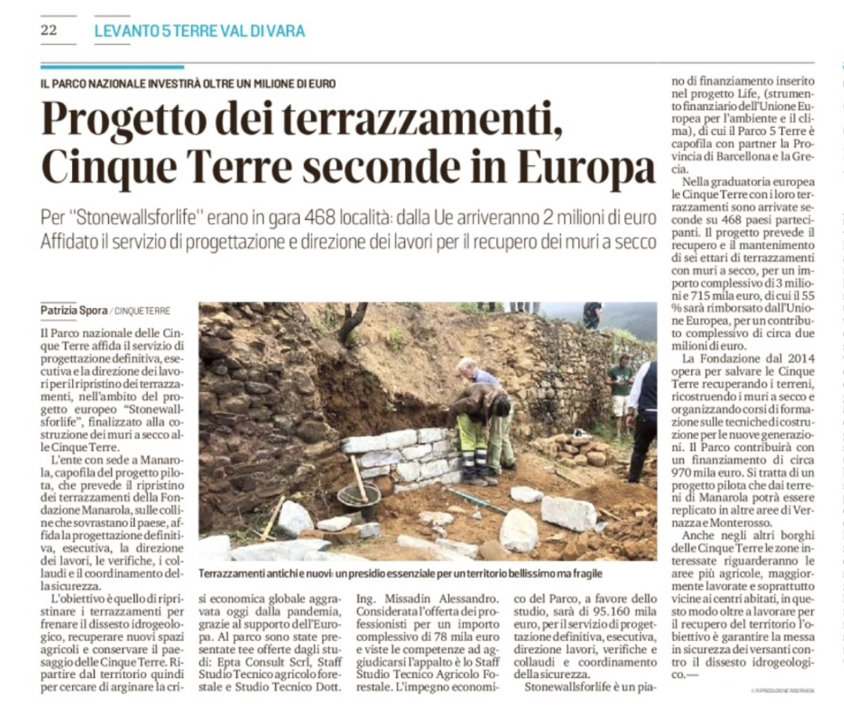 | Il Secolo XIX | 11/12/2020 | Stonewallsforlife il progetto europeo delle Cinque Terre per i muri a secco | video link |