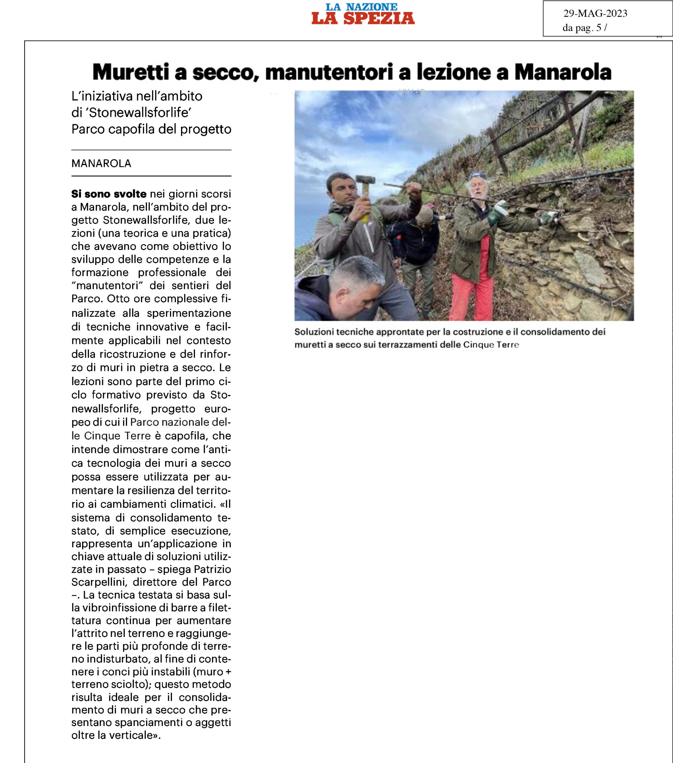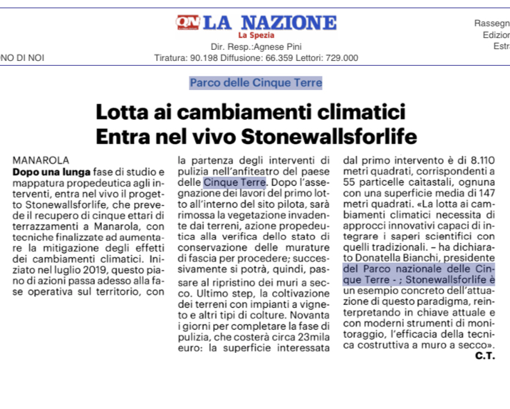 | La Nazione | 21/09/2023 | Progetto Stonewallsforlife – terrazzamenti e muri a secco nell’anfiteatro di Manarola | download |