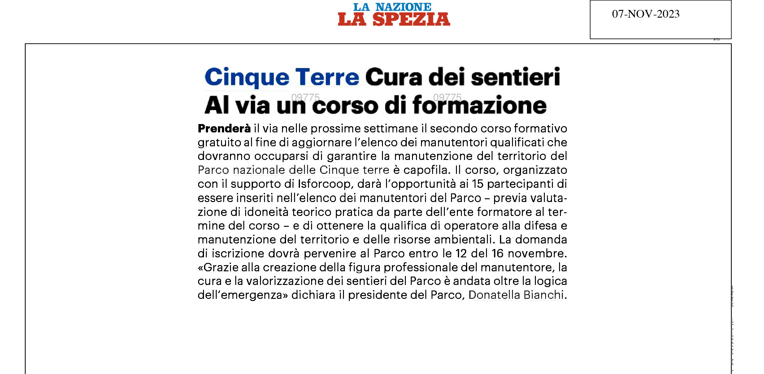 | La Nazione | 07/11/2023 | Cinque Terre, cura dei sentieri. Al via corso corso di formazione | download |