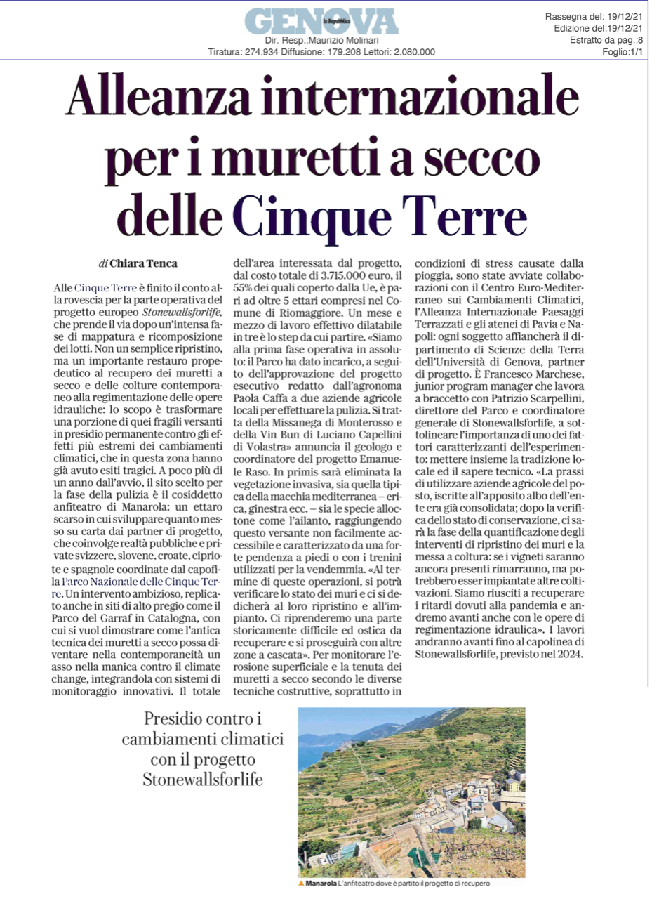 | La Repubblica | 20/12/2021 | Alleanza internazionale per i muretti a secco delle Cinque Terre | download |