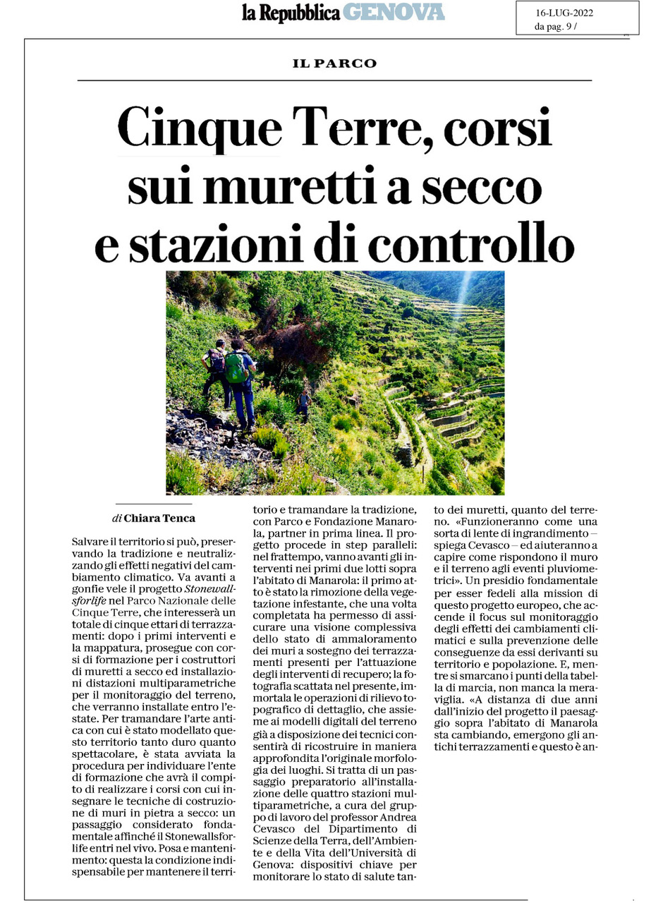 | Repubblica Genova | 16/07/2022 | Cinque Terre: Corsi sui muretti a secco e stazioni di controllo | parte 1 parte 2 |