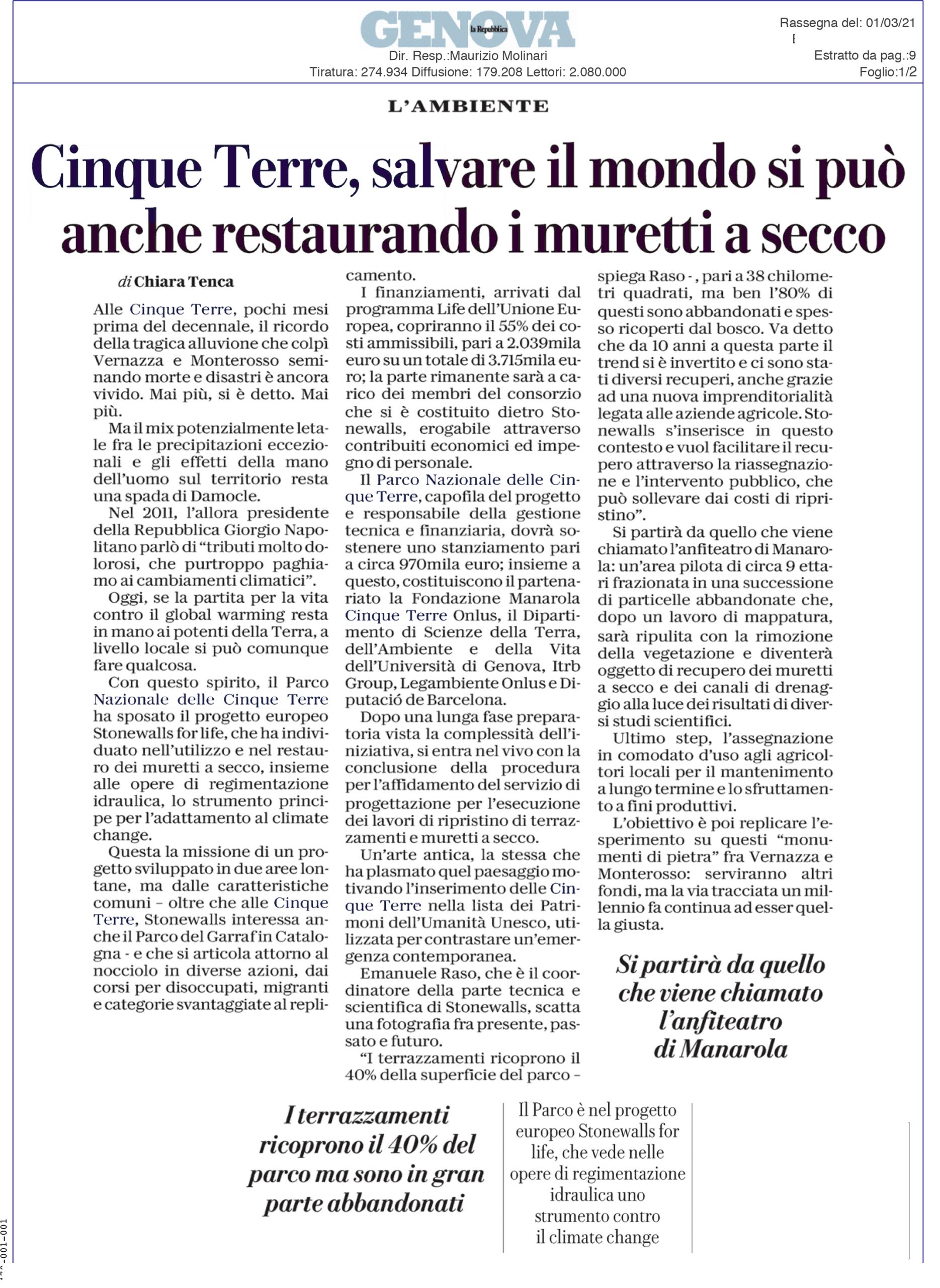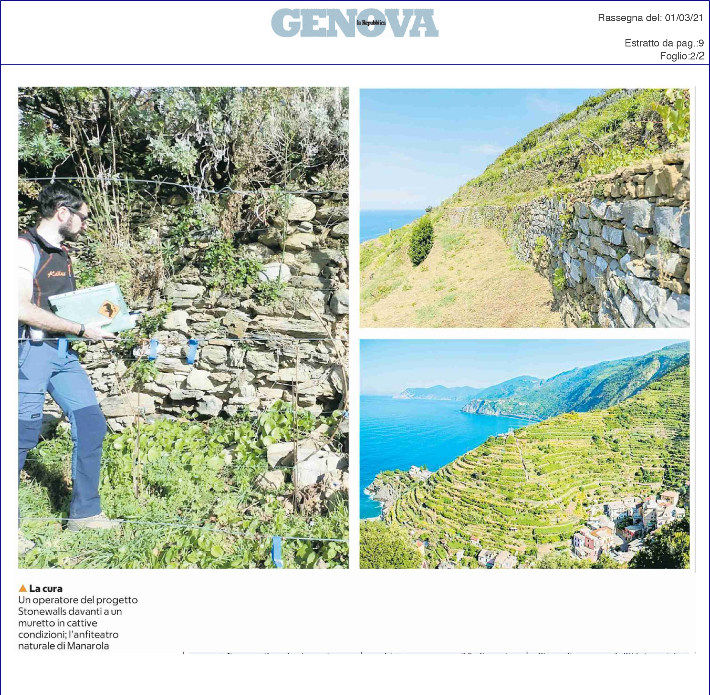 | La Repubblica Genova | 03/03/2021 | Cinque Terre, salvare il mondo si può anche restaurando i muretti a secco | page 1 page 2 |