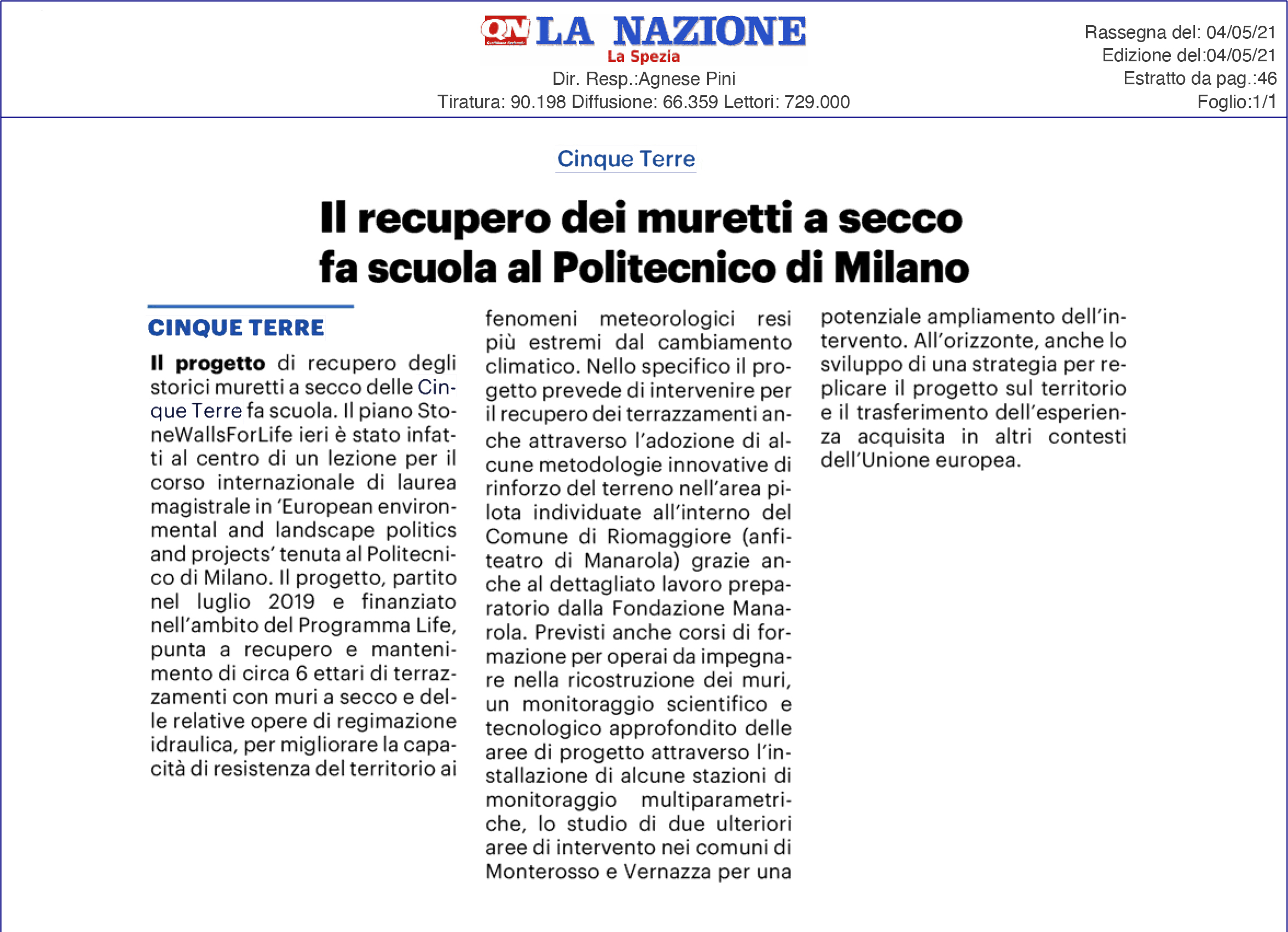 | La Nazione | 04/05/2021 | Il recupero dei muri a secco fa scuola al Politecnico di Milano | download |