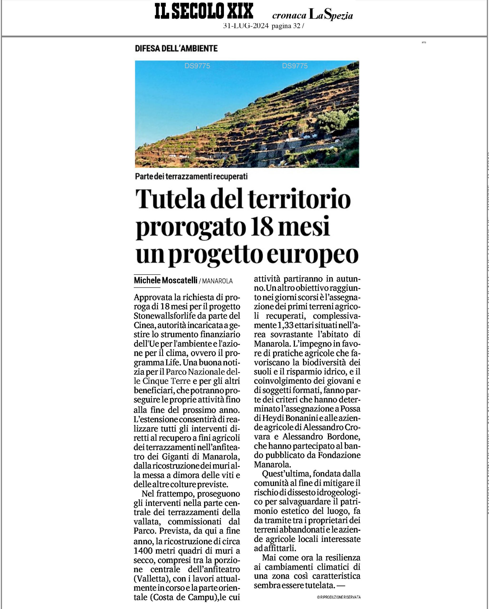 | Il Secolo XIX | 31/07/2024 | Tutela del territorio prorogato 18 mesi un progetto europeo | download |