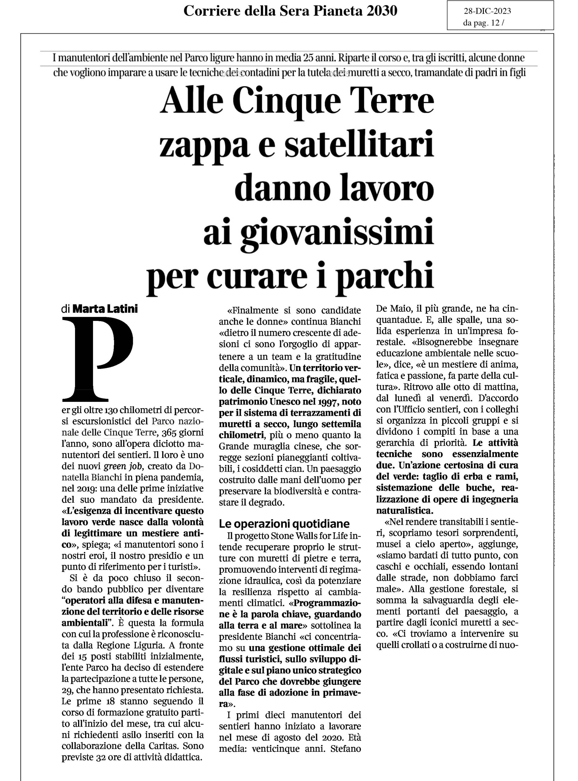 | Corriere della Sera | 28/12/2023 | Alle Cinque Terre zappa e satellitari danno lavoro ai giovanissimi per curare i parchi | download |