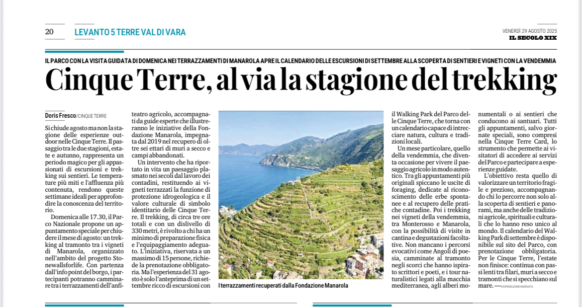 | Il Secolo XIX | 29/08/2025 | Cinque Terre al via la stagione del trekking | download |