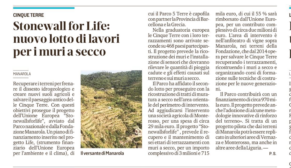 | Primocanale | 12/12/2019 | Manarola Stone Walls for Life, un progetto di recupero per i terrazzamenti | link |